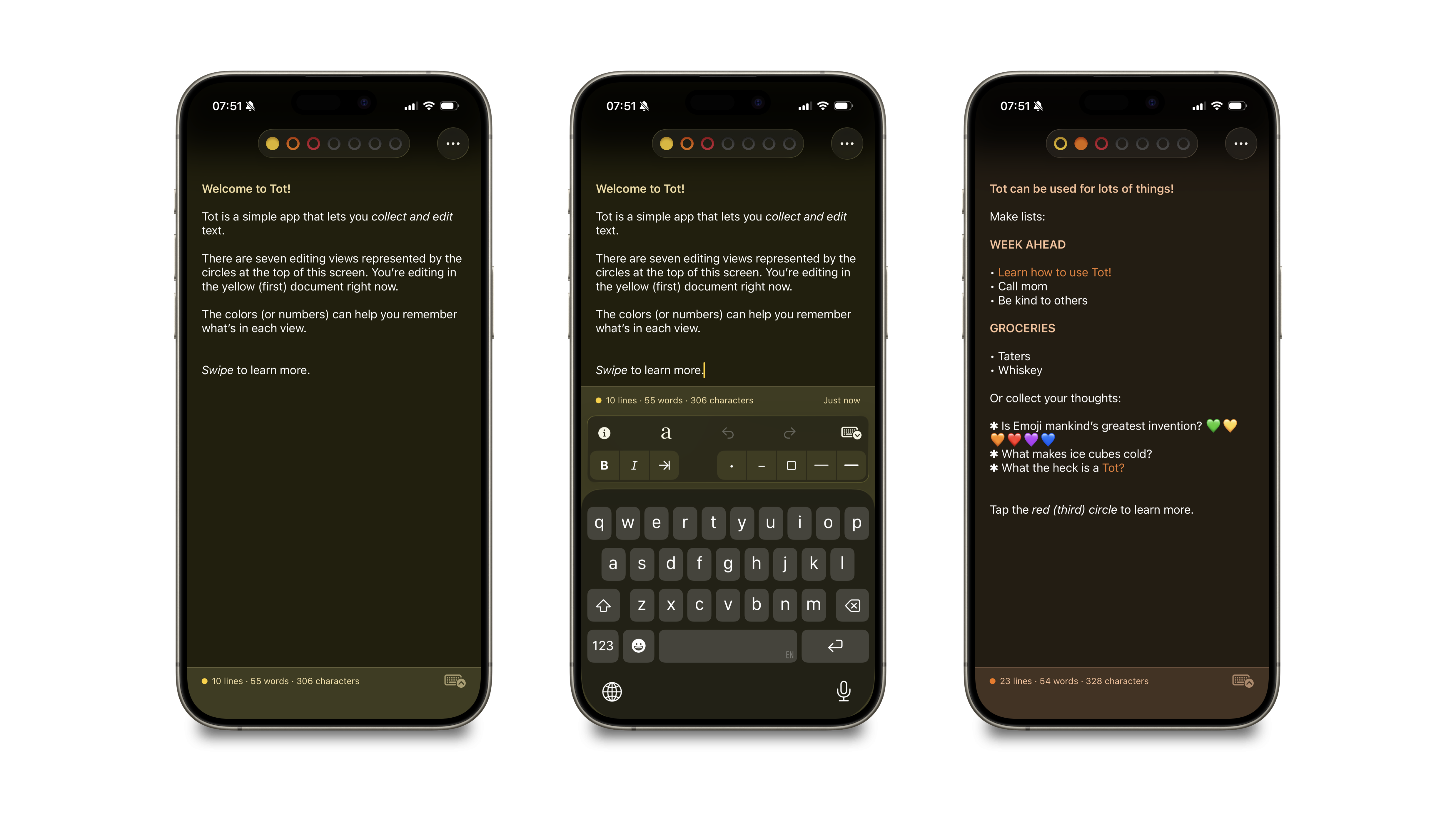 Tot is a deceptively simple app: just seven small text documents you can use to capture notes, snippets, and ideas. Iconfactory has given Tot a subtle Liquid Glass refresh that feels completely at home on iOS 26. The subtle glass accents make the minimal interface feel a bit more fun, while still keeping focus on your text.